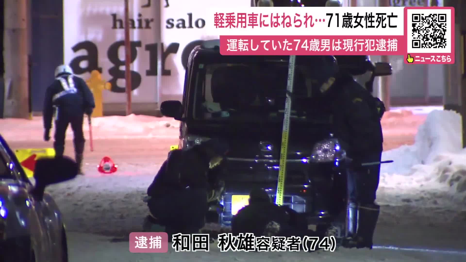 12月18日夕方、札幌市手稲区の市道で、高齢の女性が軽乗用車にはねられた事故で、その後、女性は死亡しました。軽乗用車を運転していた74歳の男が逮捕されました。
