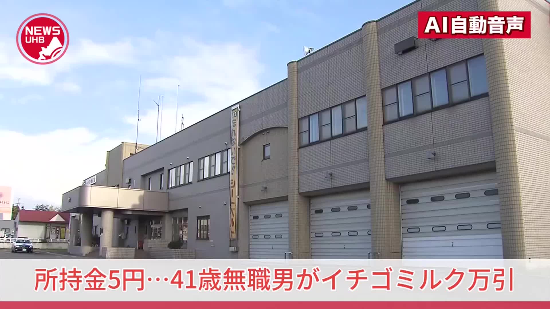 男は12月17日午前11時20分ごろ、北海道岩見沢市のスーパーで、イチゴミルクとオレンジジュースの合わせて2本、販売価格224円を盗みました。