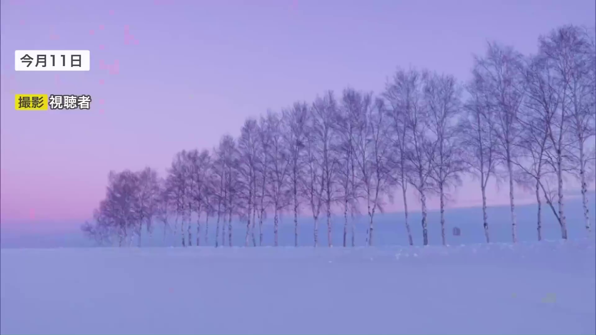 雪と朝焼けの中で立ち並ぶ木々が織りなす幻想的な光景。1月11日に撮影された、美瑛町を代表する1枚です。