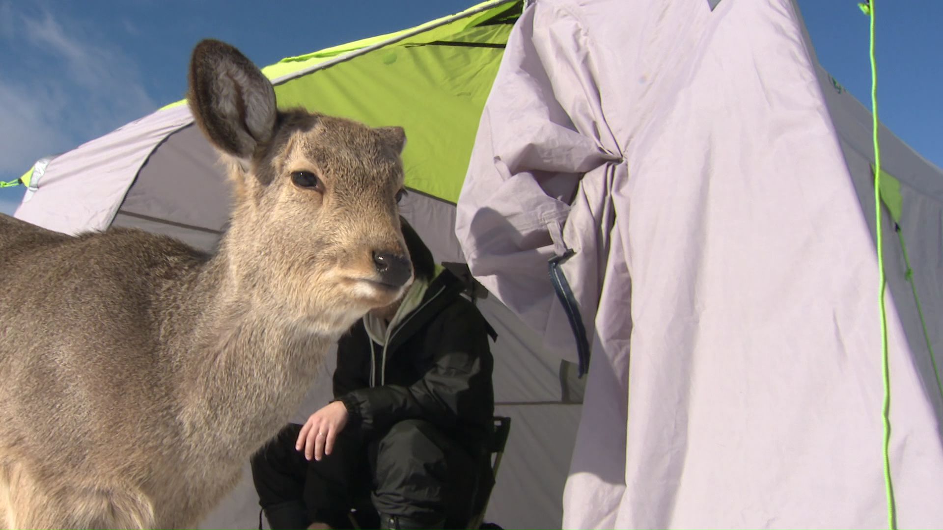 「シカがワカサギ釣りのテントの中に入っていきました」(沼田 海征 記者)