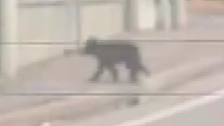 道路を横断するクマ。クマは、まわりをキョロキョロしながら建物の方へ歩き去りました。付近住民に不安が広がっています。