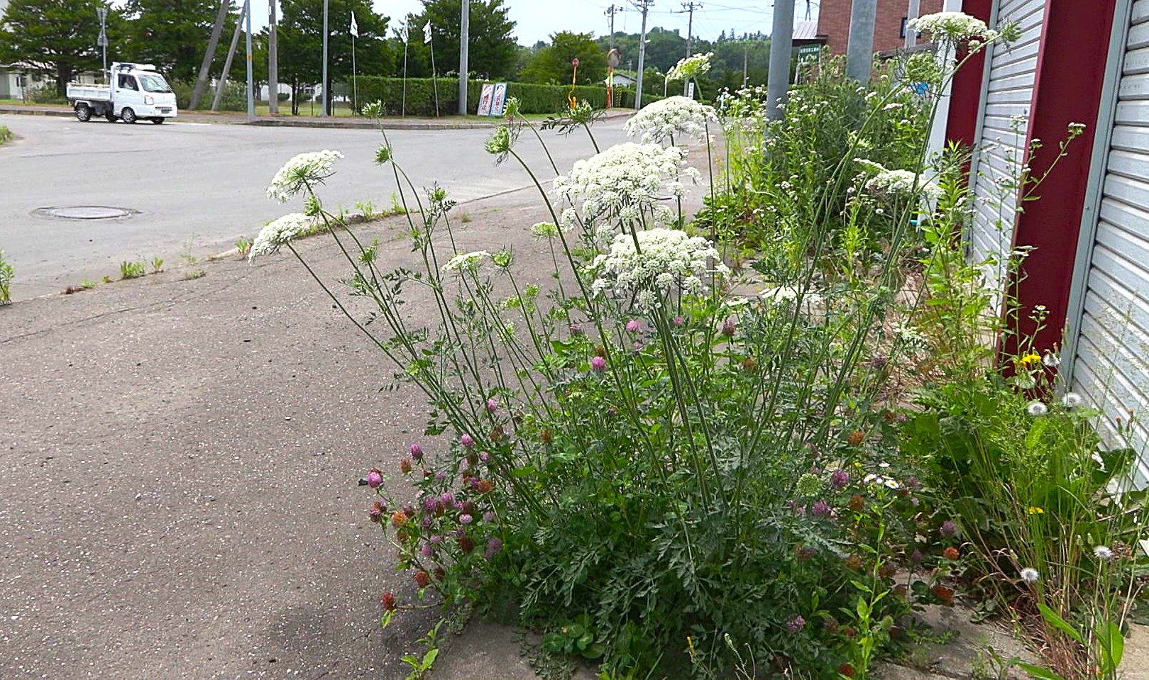 北海道には、形状がよく似たオオハナウドが自生していますが、バイカルハナウドの場合は、背丈が2メートル以上と大きく、茎に紫色の斑点があり、ギザギサが深い葉を持ち、7月初旬に白い花が咲くのが特徴だということです。