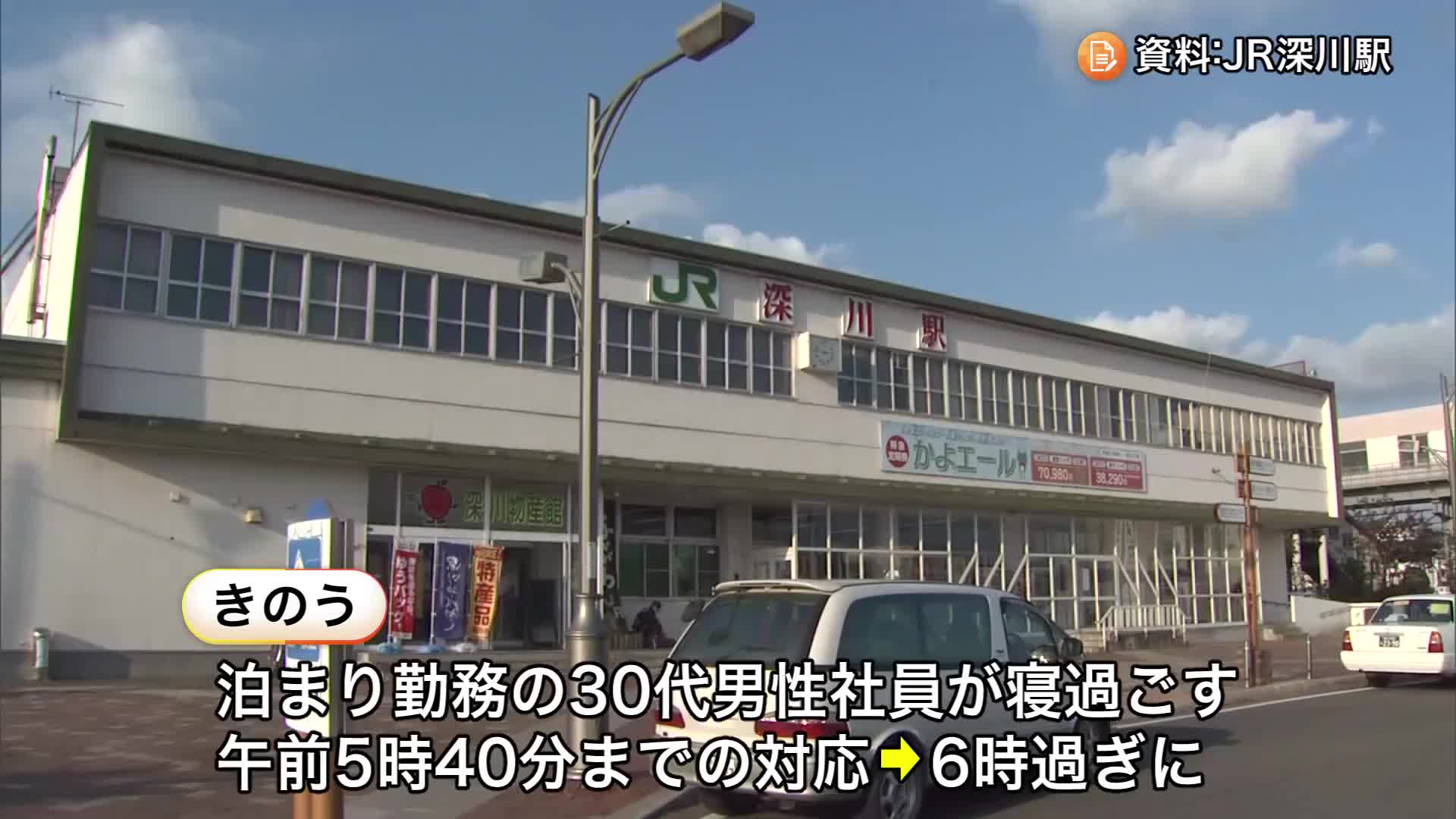 JR北海道によりますと、深川駅では午前5時40分までにドアを開ける予定でしたが、27日は泊まり勤務の30代の男性職員が寝過ごし、午前6時すぎまで対応できませんでした。