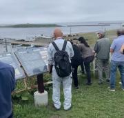 公園から海の様子を心配そうに見つめる人たち。作業着姿の人もいます。