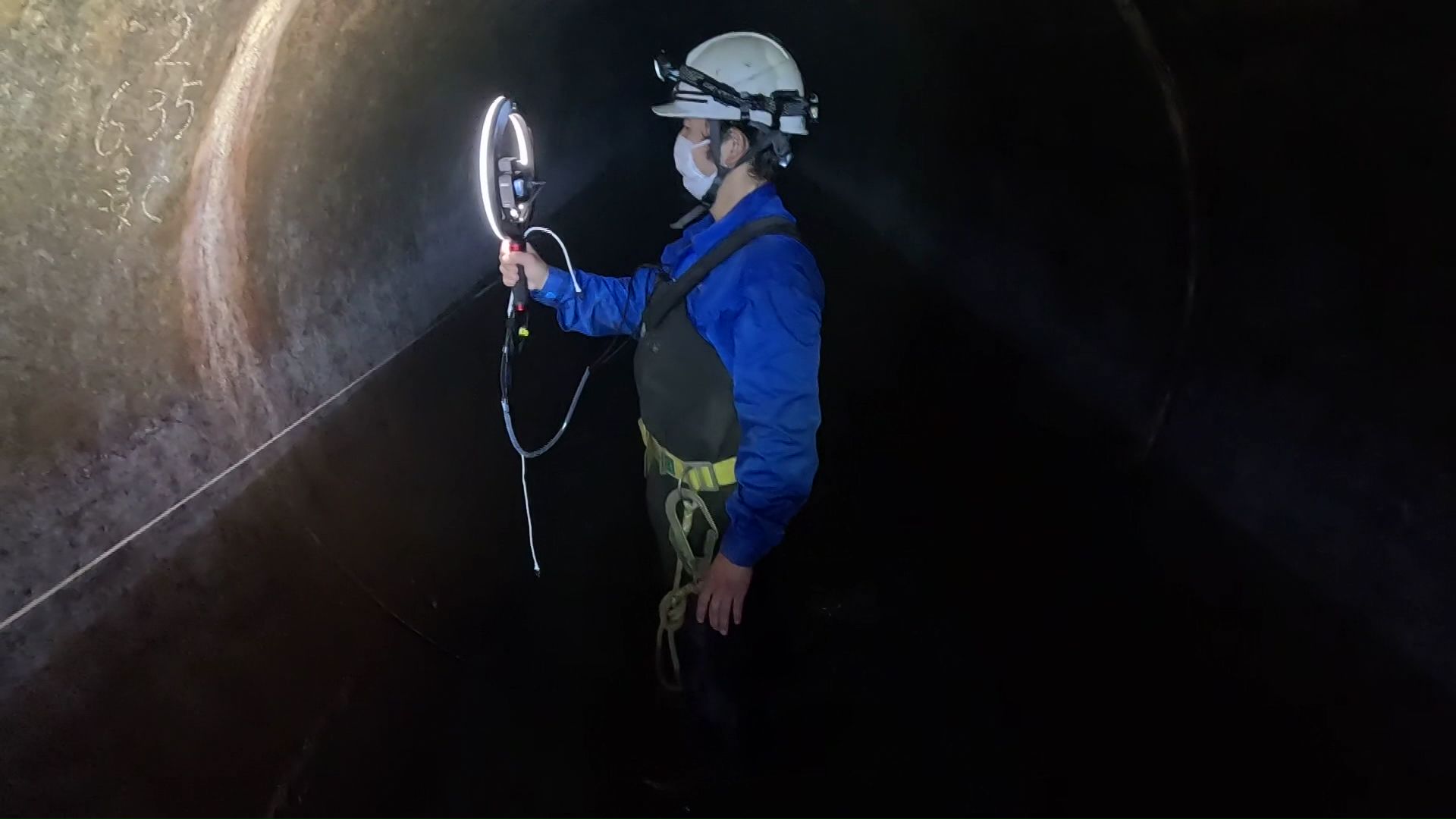 地下5メートル地点にある下水道管の中に作業員が入り、徒歩で光を当てながら管にひび割れがないか、念入りに見て回りました。