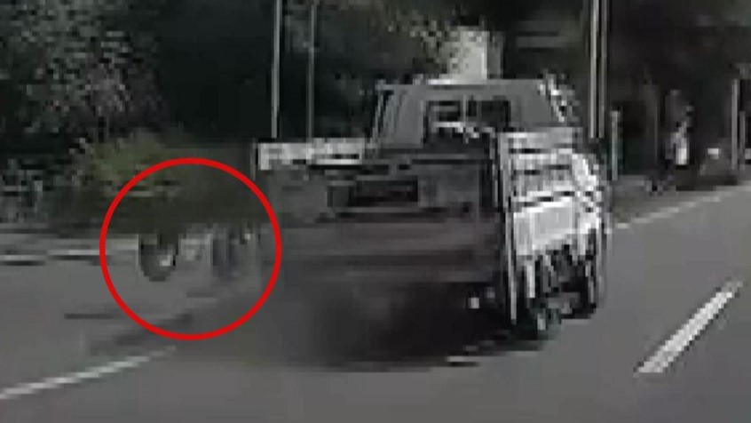 前を走る白色のトラック。突然、車体が傾き、タイヤ2本が脱落、左側の歩道に乗り上げます。さらに、1本は車道を勢いよく転がり、対向車線の乗用車に衝突しました。