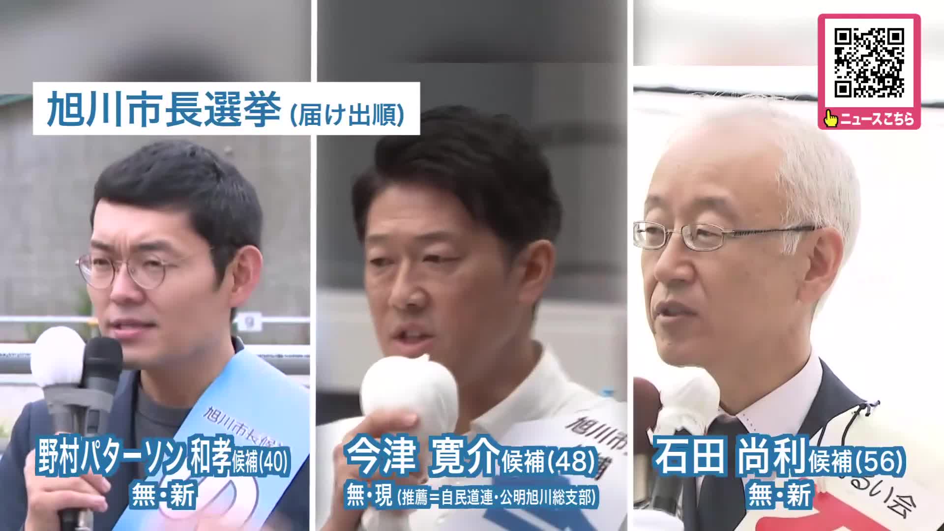 立候補したのはいずれも無所属で届け出順に、新人で元旭川市議の野村パターソン和孝候補、現職で2期目を目指す今津寛介候補、新人で共産党旭川地区委員長の石田尚利候補の3人です。