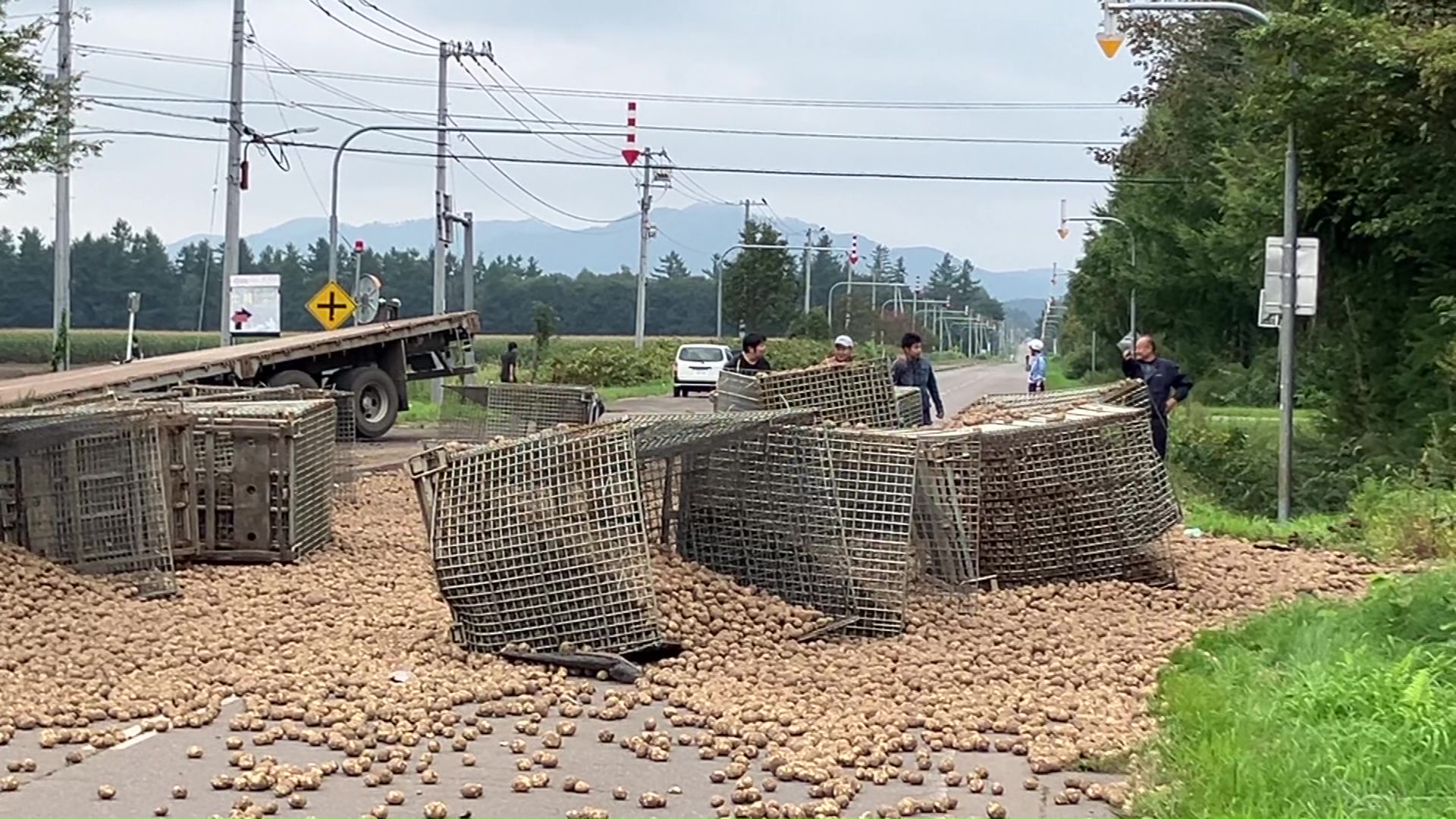 一方、十勝の士幌町の事故現場で、道路に散乱しているのはジャガイモです。