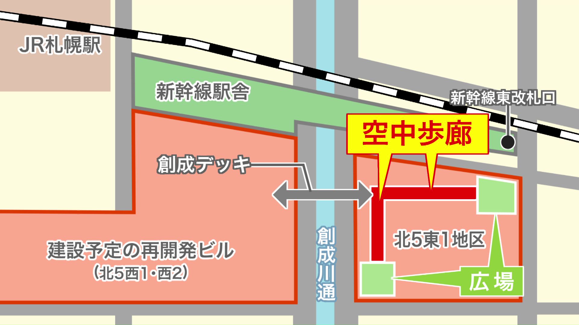 札幌市は、札幌駅南口の北5条西1丁目と2丁目の再開発ビルと創成川東側の北5条東1丁目の創成イースト地区を空中で結ぶデッキを計画しています。