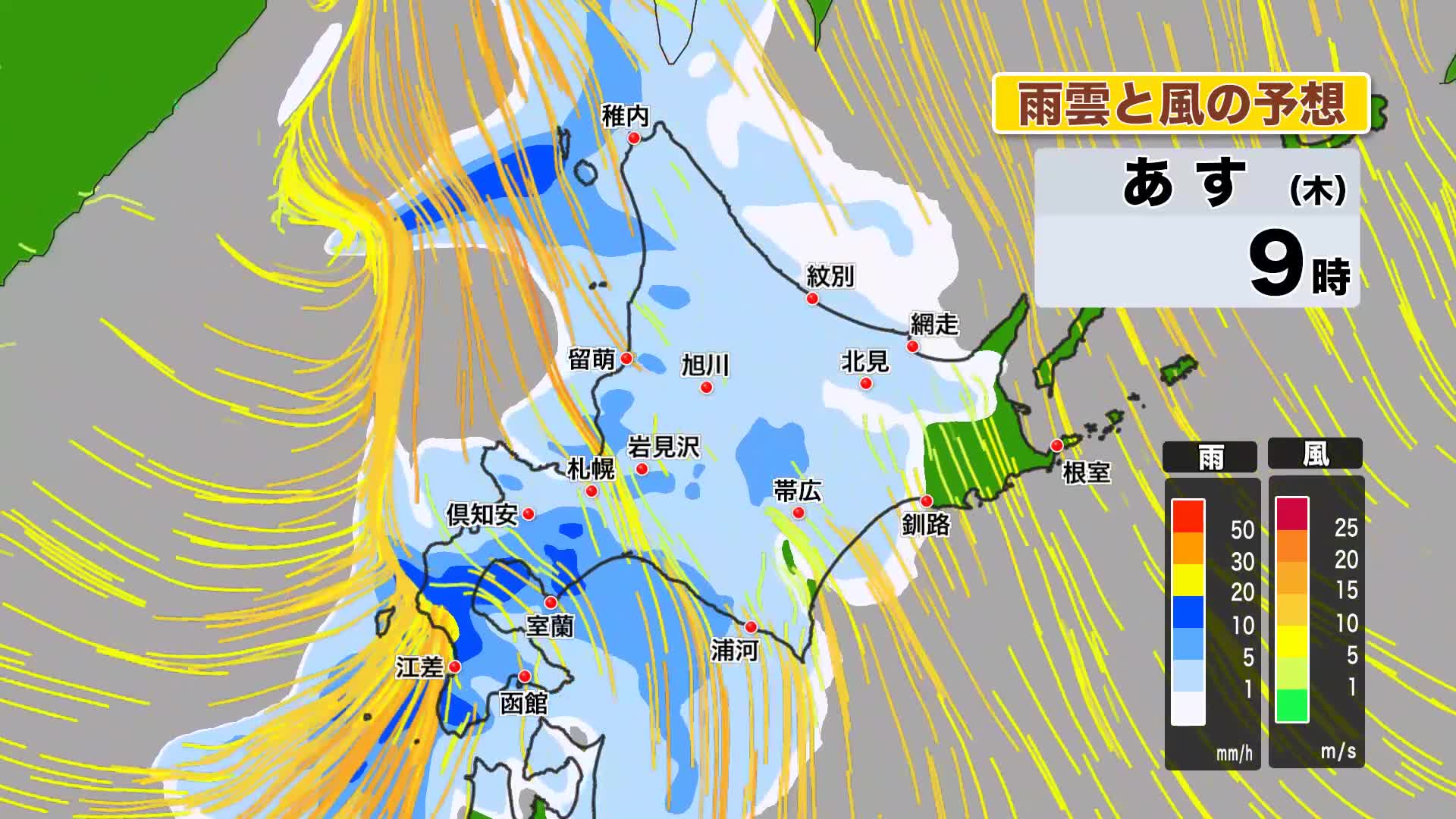 あす25日は、前線を伴った低気圧が北海道を通過する影響で、道内は荒れた天気になる予想です。