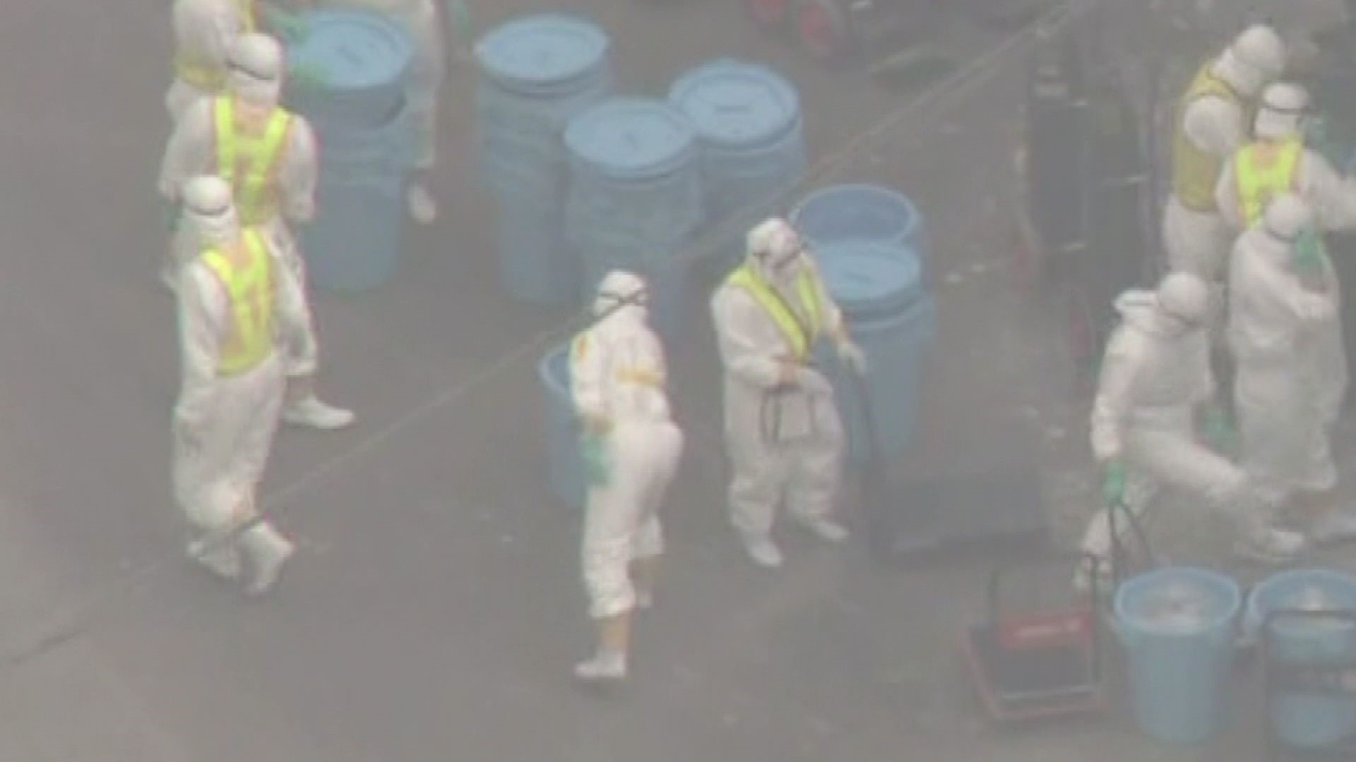 「白い防護服を着た作業員を乗せたバス3台が中に入りました。これから殺処分が行われるとみられます」(小出昌範 記者)