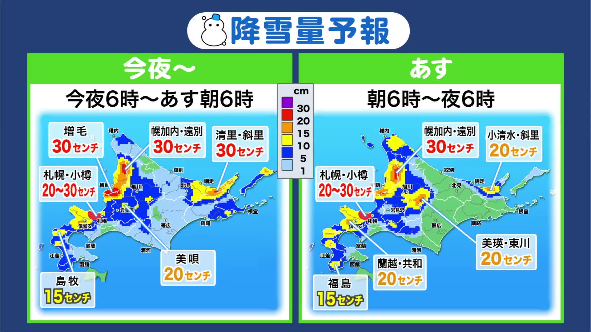 小樽市、余市町、留萌市幌糠、赤井川村では30センチ以上、