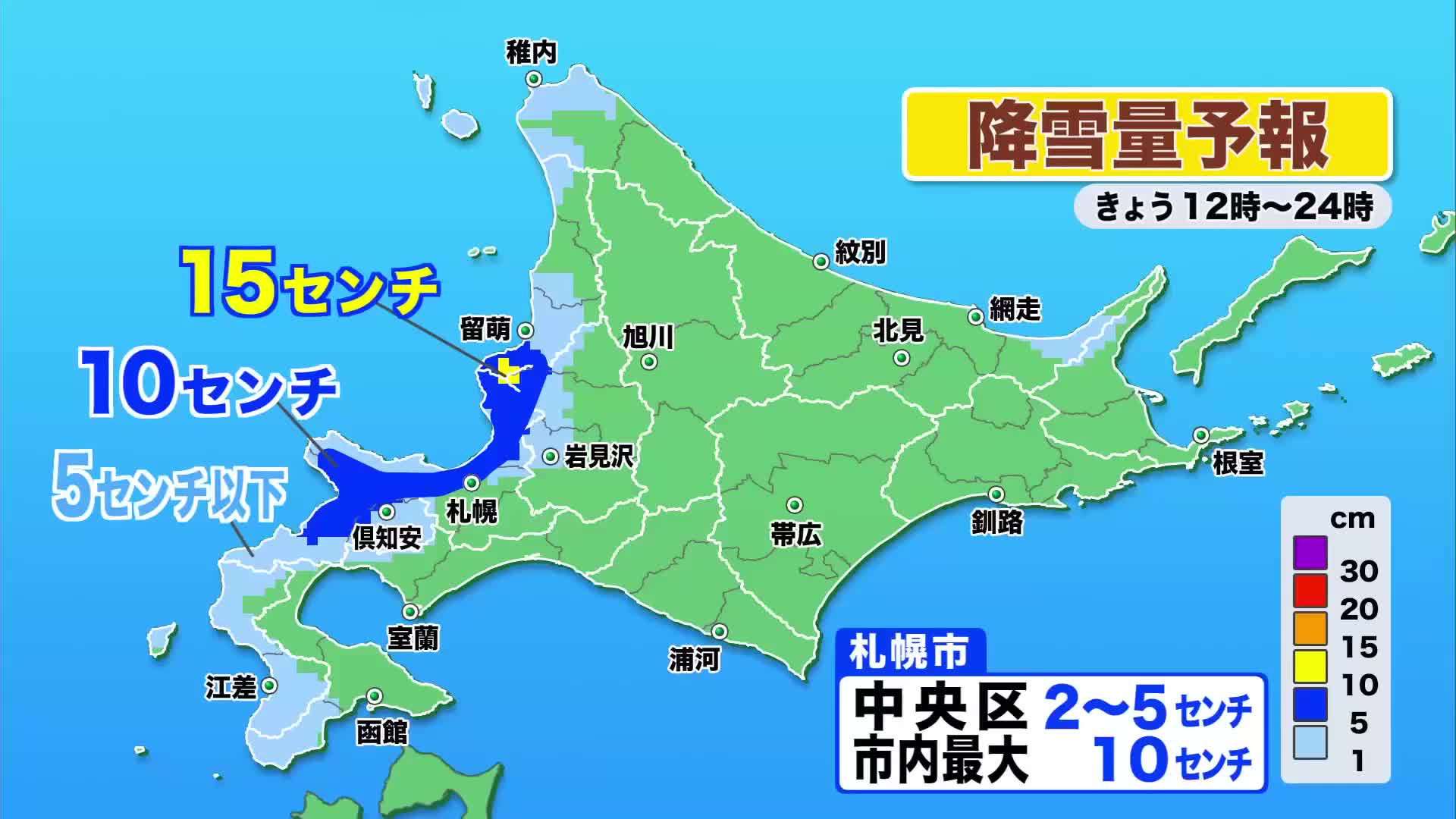 今夜遅くにかけての降雪量は留萌市の山沿いで15センチ、