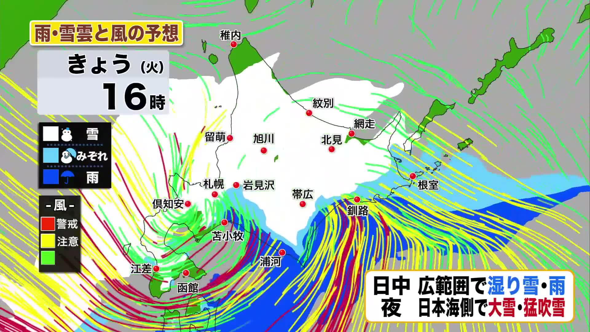 【北海道の天気 13日(火)】低気圧の通過で天気が急激に悪化…夜にかけて30センチの大雪!猛吹雪のところも