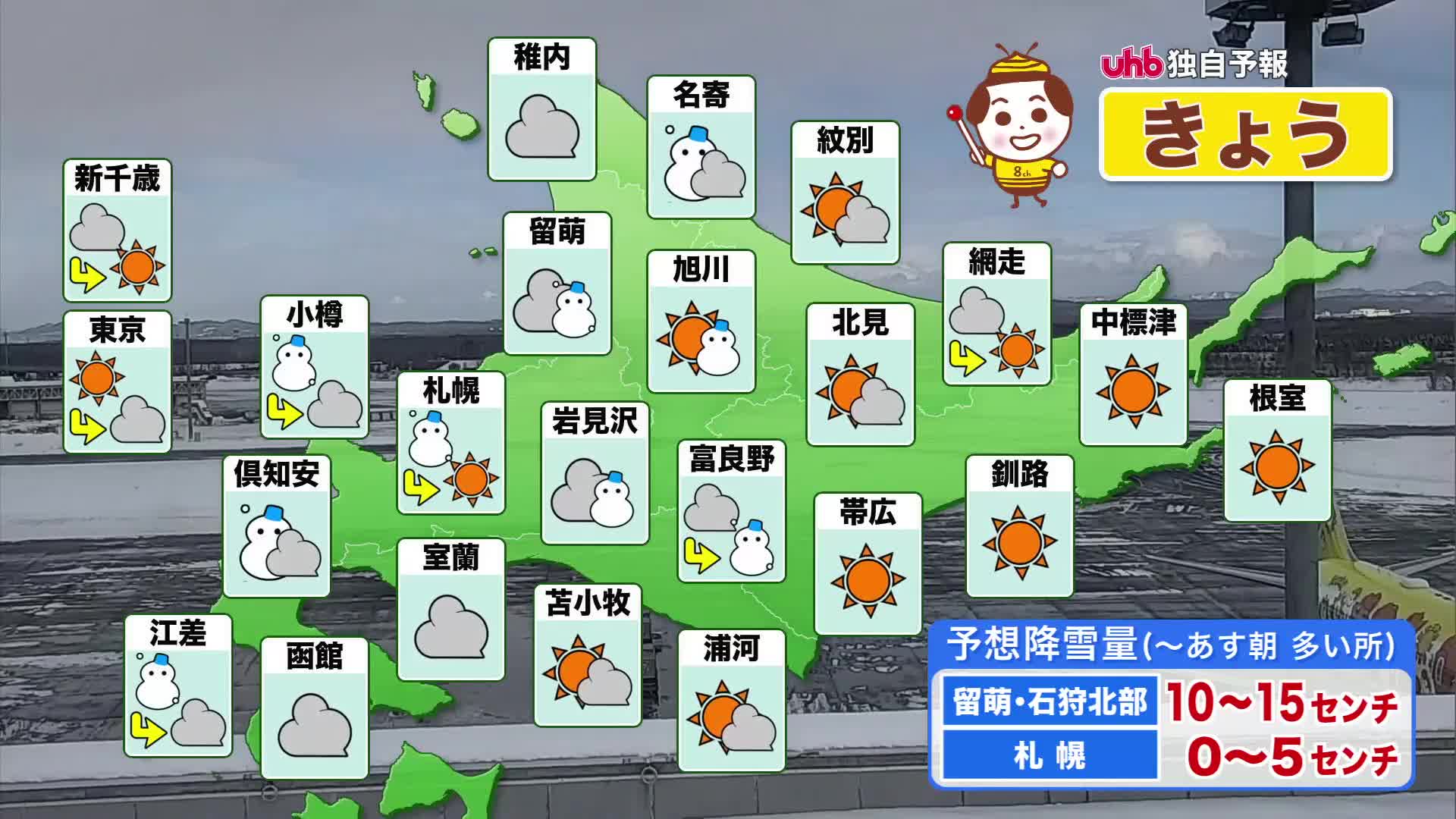 札幌は-3℃、名寄、富良野、倶知安は-6℃と、平年を下回る寒さが続きます。