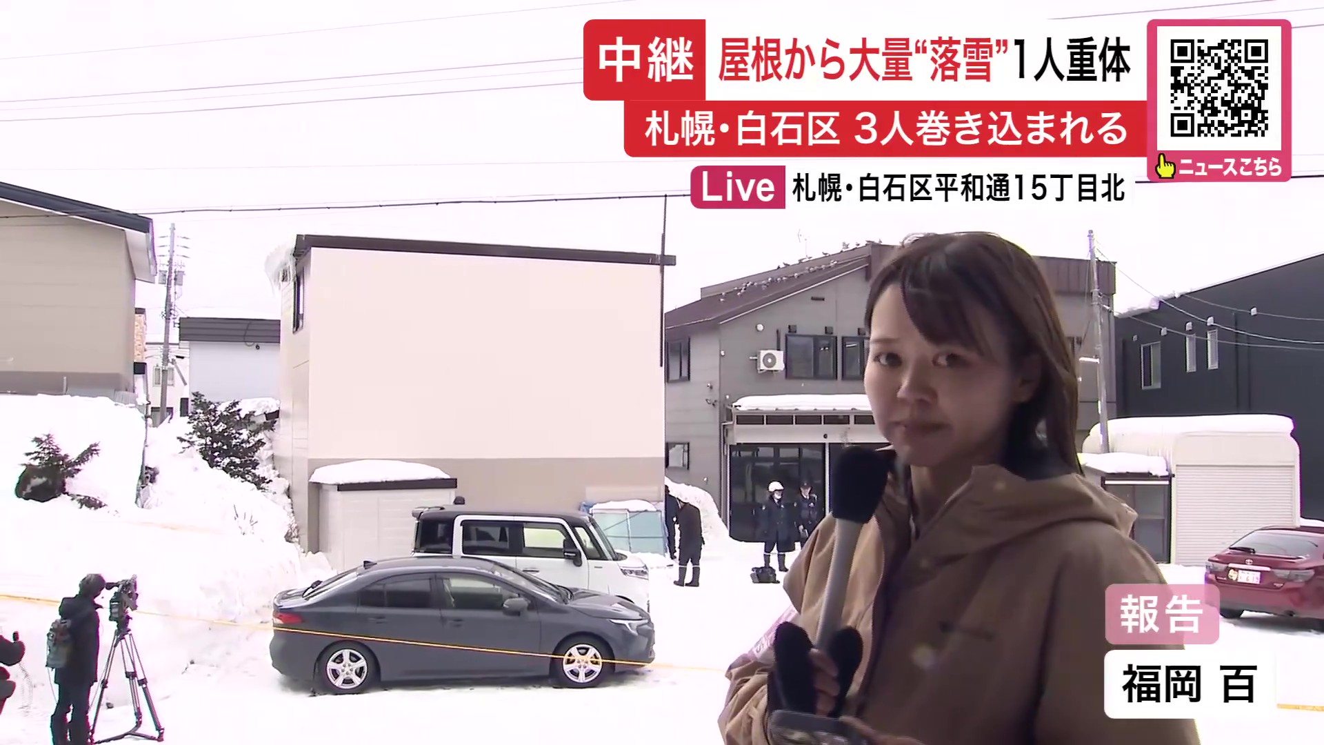 「現場はベージュ色の建物とみられています。あちらの1階部分の屋根から雪が落ちたとみられています」(福岡百 記者)