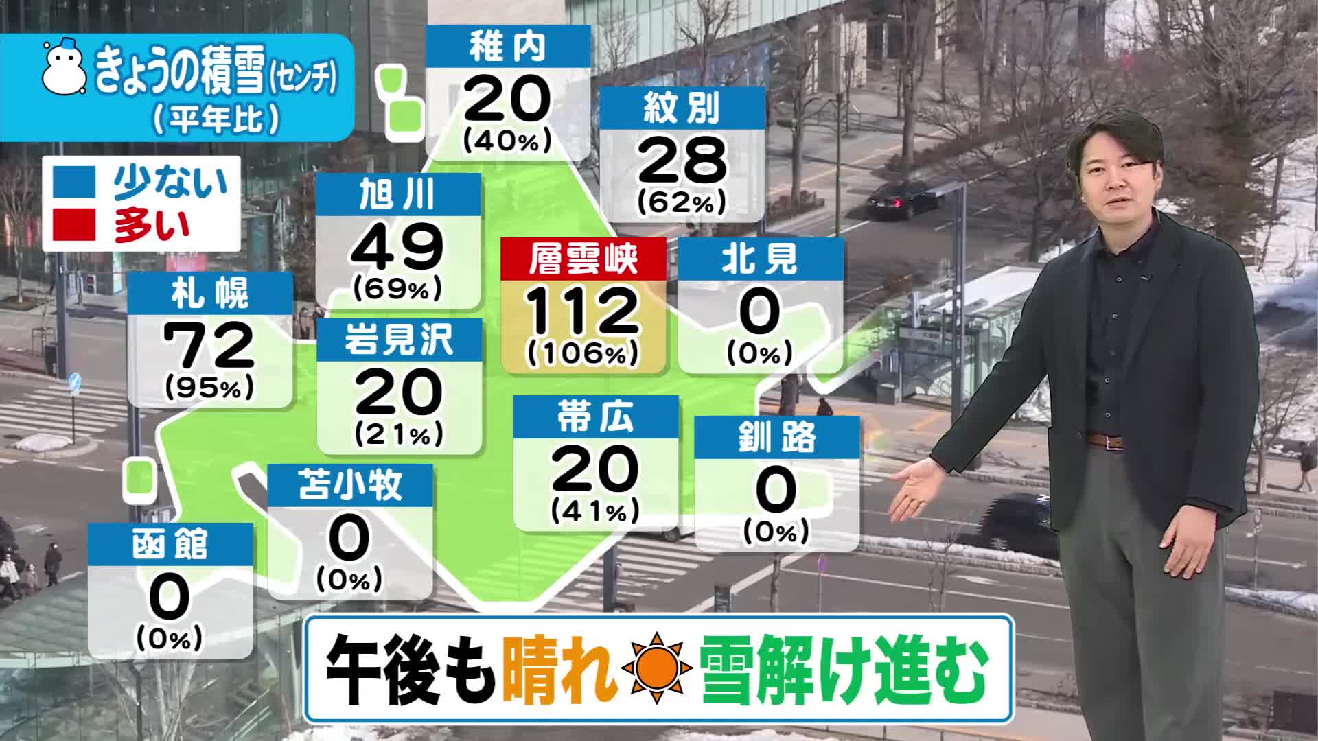 岩見沢は20センチで平年の21%。札幌は72センチで、平年の95%です。