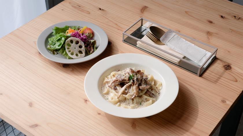 ・青柚子胡椒ときのこのクリームパスタ 1300円 サラダ付き