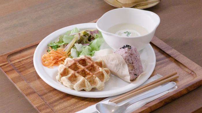 ・ワンプレートセット 1100円 天然酵母ワッフル+豆ごはんおにぎり+豆乳スープ