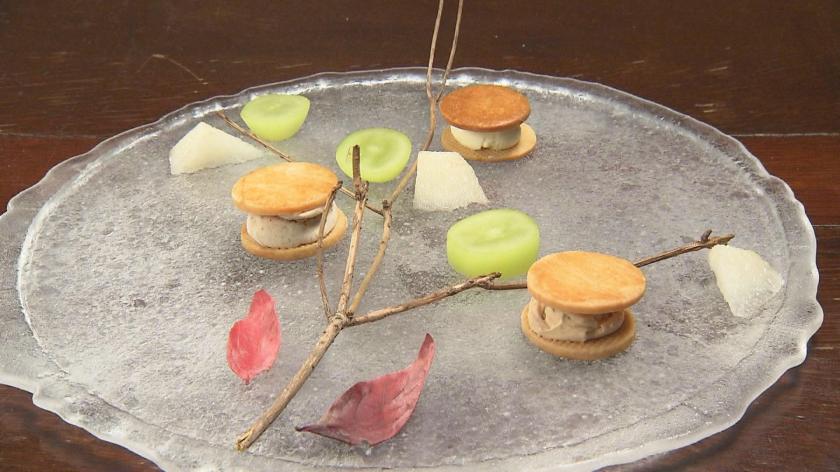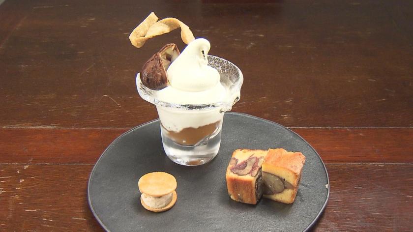 今月のお菓子皿 1200円(+税)…和栗のミニパフェ、栗のテリーヌ、小さなバターサンド付き