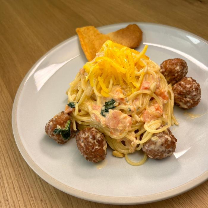 鶏ミートボールのゆずクリームスパゲティ 酒かすチップを添えて 1375円