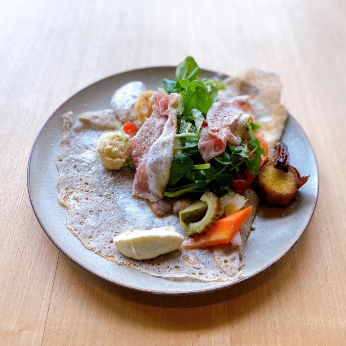 ルスツ豚の自家製ベーコンと羊蹄野菜いっぱいのそば粉ガレット 1350円