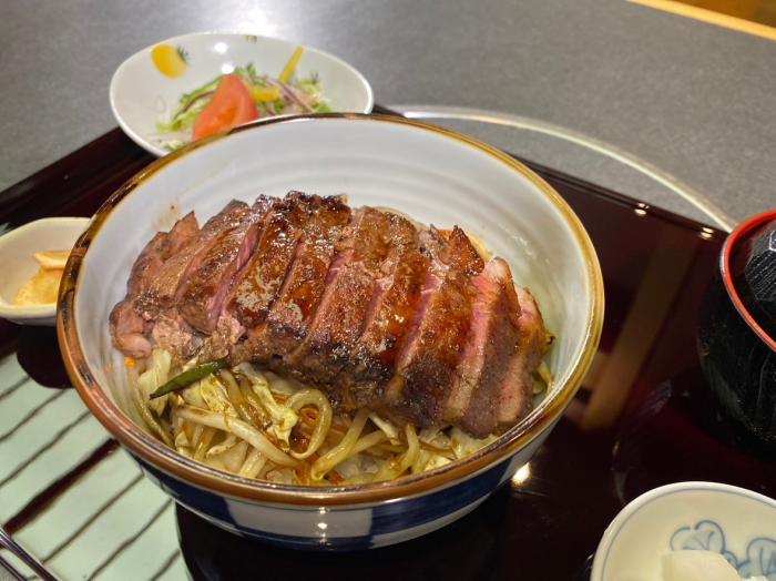 ステーキ丼盆(サラダ・香の物・汁物付き) 1880円 ※食後にコーヒーサービス