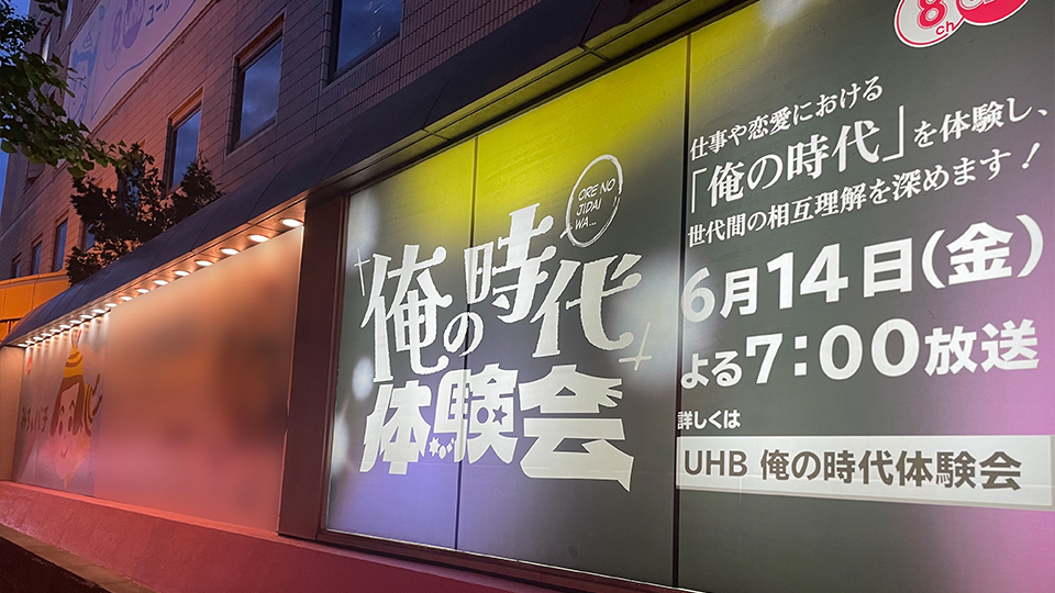 社屋横に掲出された「俺の時代体験会」看板
