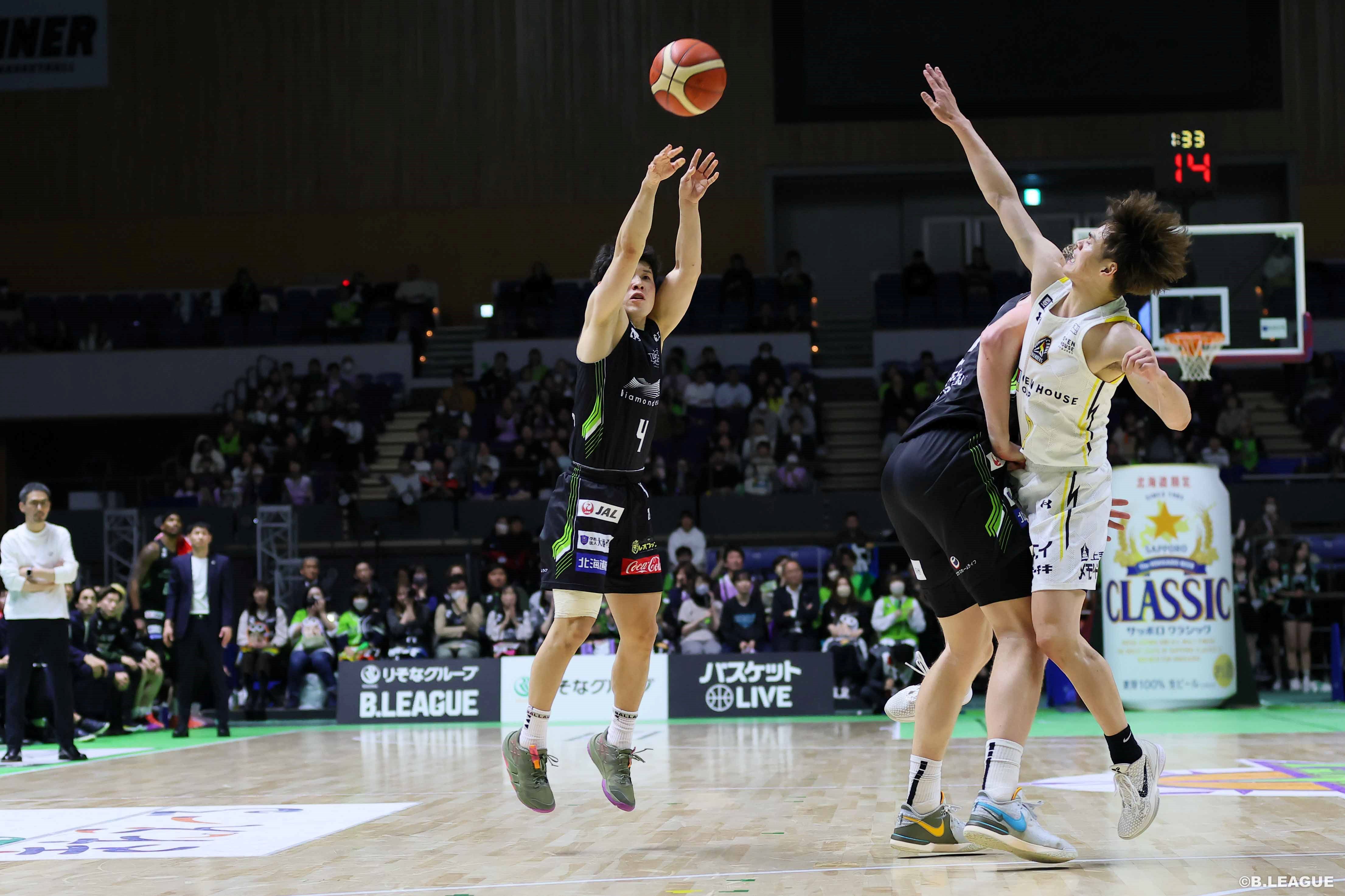 札幌市出身の日本人ビッグマン内藤輝悠選手がライアン・クリーナー選手の穴を埋めるファイトを見せる。リーグ屈指のシューター群馬の辻直人選手が爆発し逆転を許すものの、寺園脩斗選手がクラッチタイムをけん引。大事な場面で3ポイントを決めきり再びリードを奪い96-92で群馬を制す。