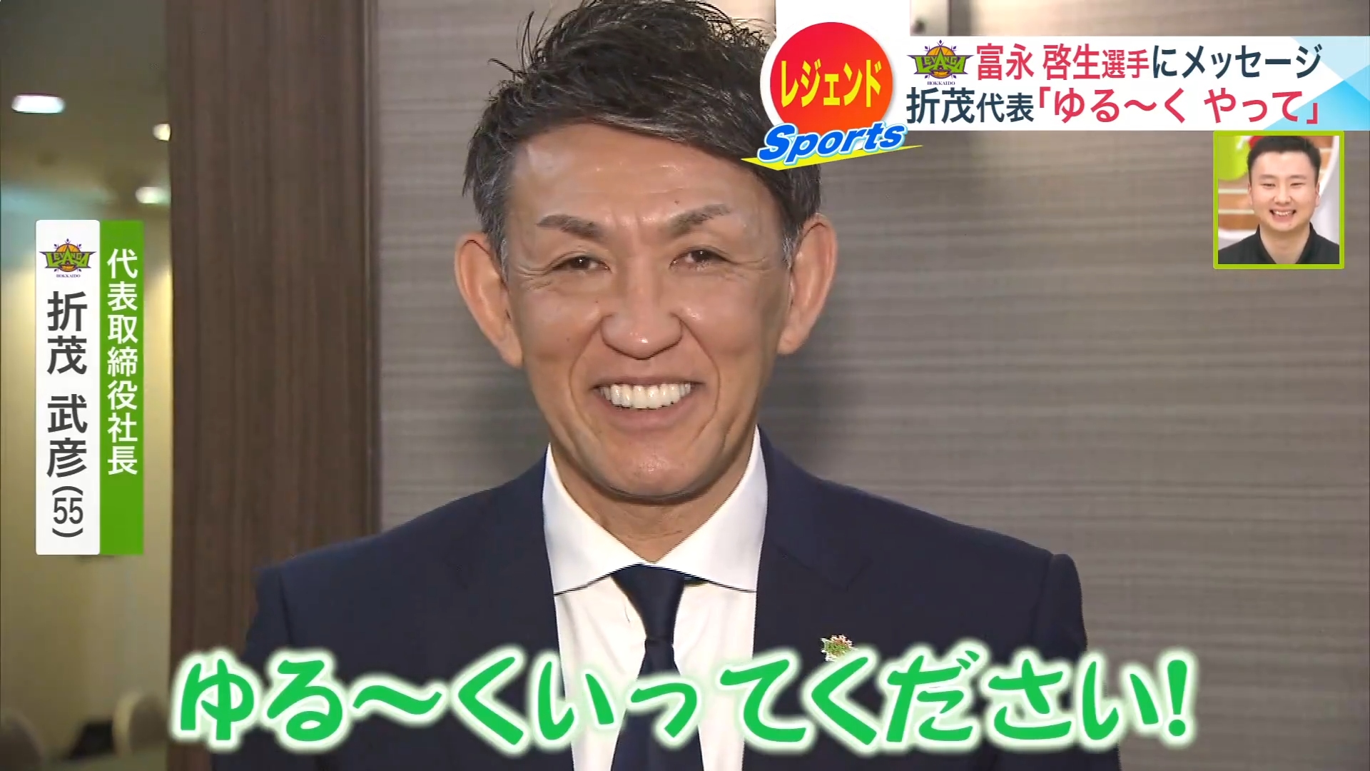 「レバンガ北海道の折茂です。富永選手、まずは記者会見お疲れ様でした。これからUHBの生放送ということで、そんなに緊張しないでゆるーくいってください。富永選手はお寿司が大好きということで、一番美味しいお寿司屋さんに連れてきたいと思いますので、ぜひお楽しみあれ」