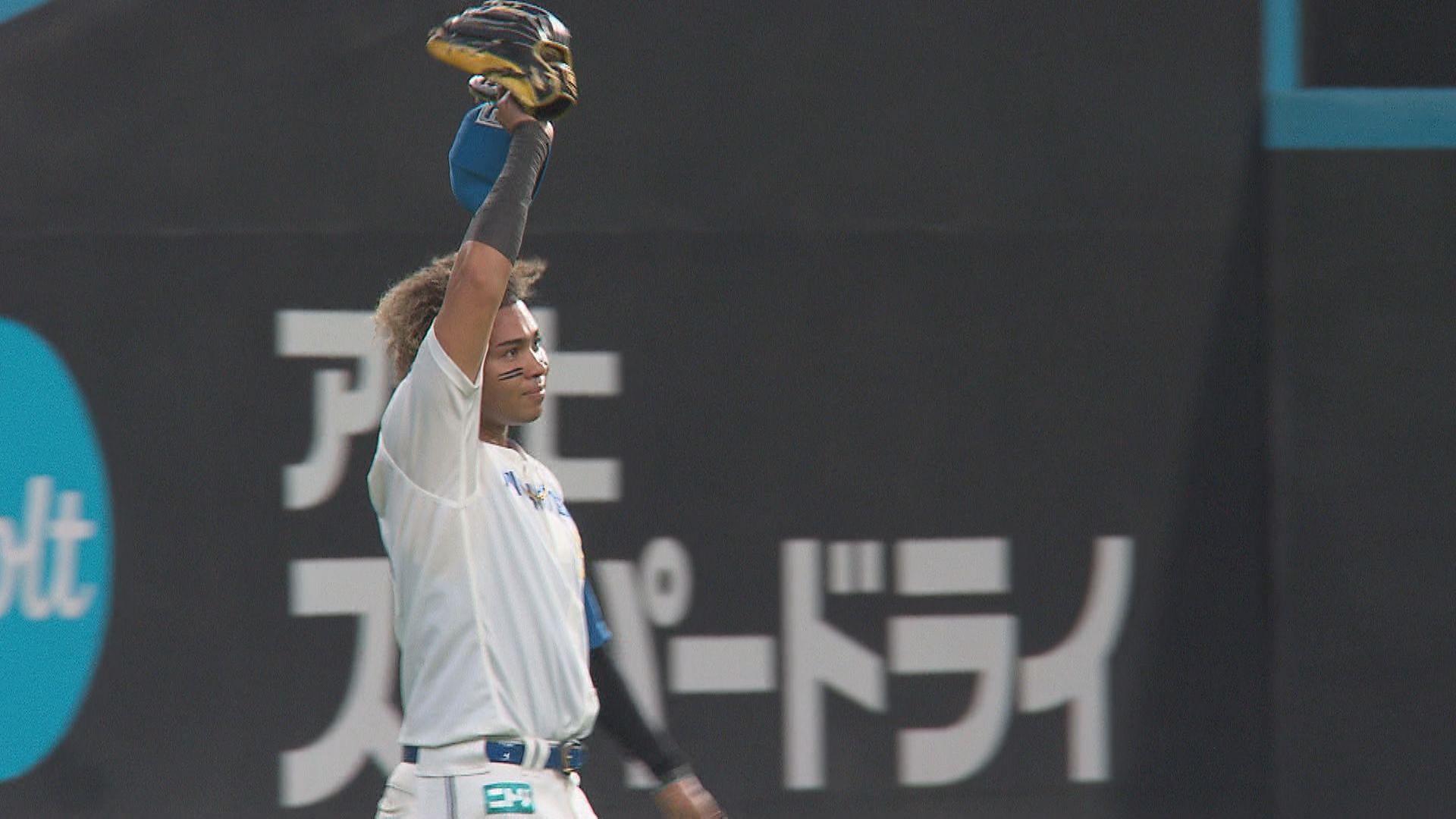 3点を追うファイターズは、この回もすぐに反撃に出ます。一死からレイエスがレフト前ヒットで出塁、郡司裕也が死球で一、二塁とします。ここで、このシリーズでまだヒットが出ていなかった清宮幸太郎がセンターへの2点タイムリースリーベースヒットで3-4と1点差に迫ります。