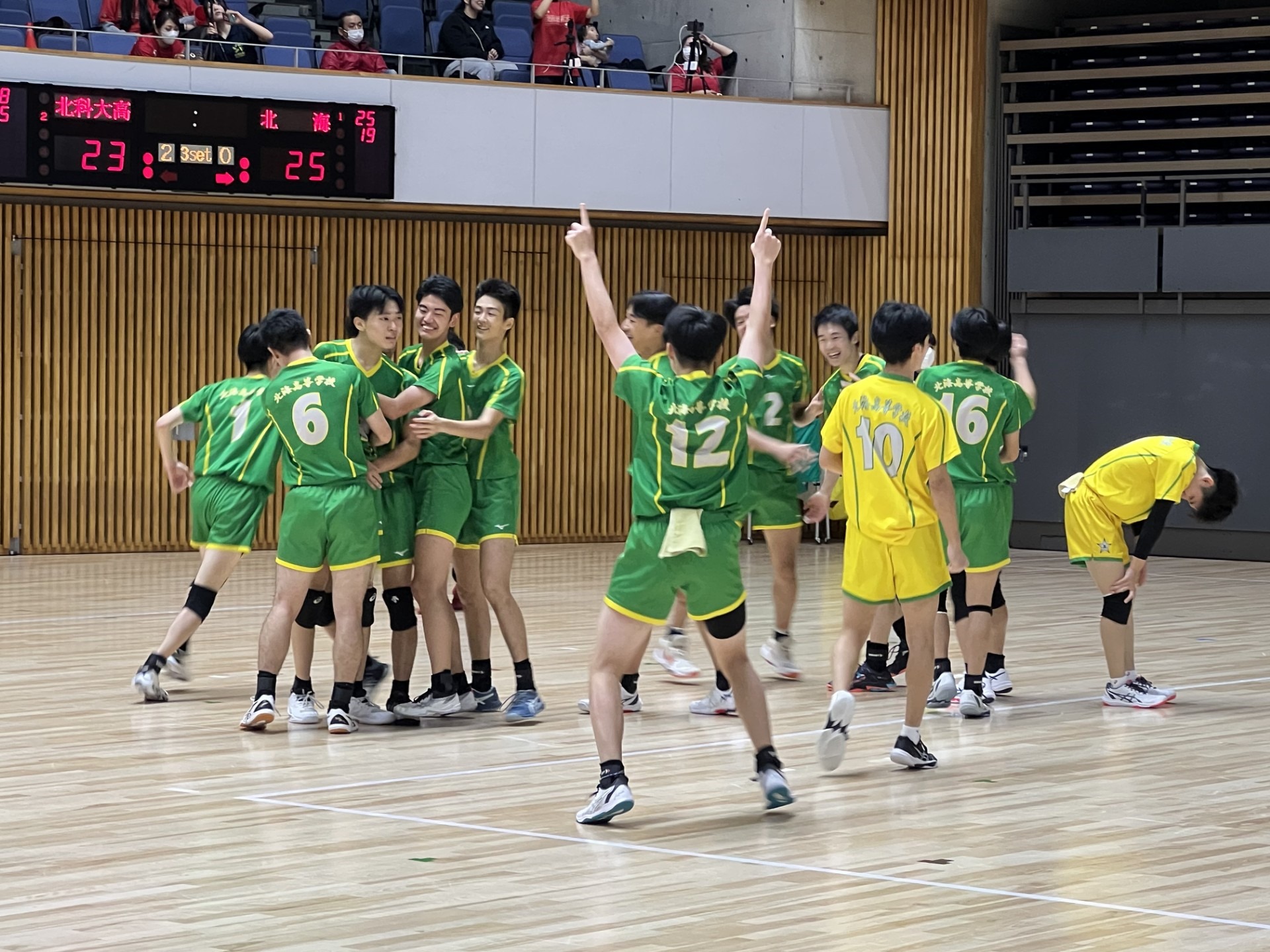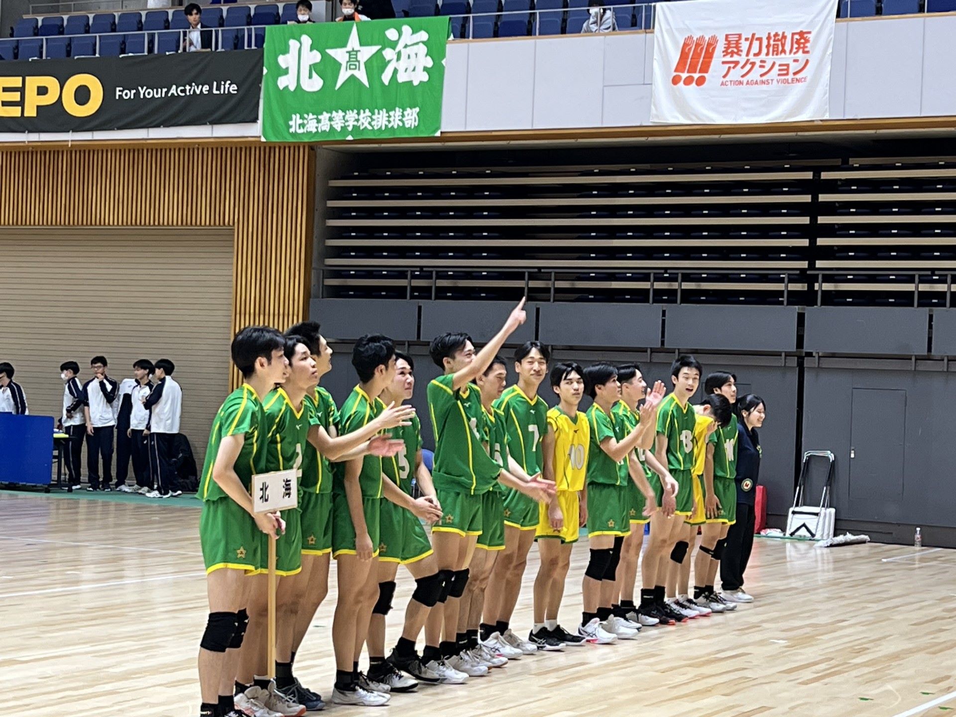 昨年の優勝校・北海道科学大学高校とベスト4進出をかけて対戦した北海高校(16年連続26回目の出場)は、第1セットを先取します。しかし第2セットは前年王者に取り返され、試合はフルセットの戦いへ。第3セットは終始相手にリードを許す展開となり、一時は4点差まで広げられます。しかし、この試合19得点の須藤選手と18得点の村上主将の両アタッカーの攻撃を軸に徐々に詰め寄り、22点目で追いつきます。そして終盤ついに逆転。最後は1年生・瀬川選手のブロックで試合を決め、学校を終えて急遽応援にかけつけた生徒達の大声援の前で、北海高校が2005年以来20年ぶりのベスト4進出を決めました。(第36回全国高等学校バレーボール選抜優勝大会・南北海道予選会以来)