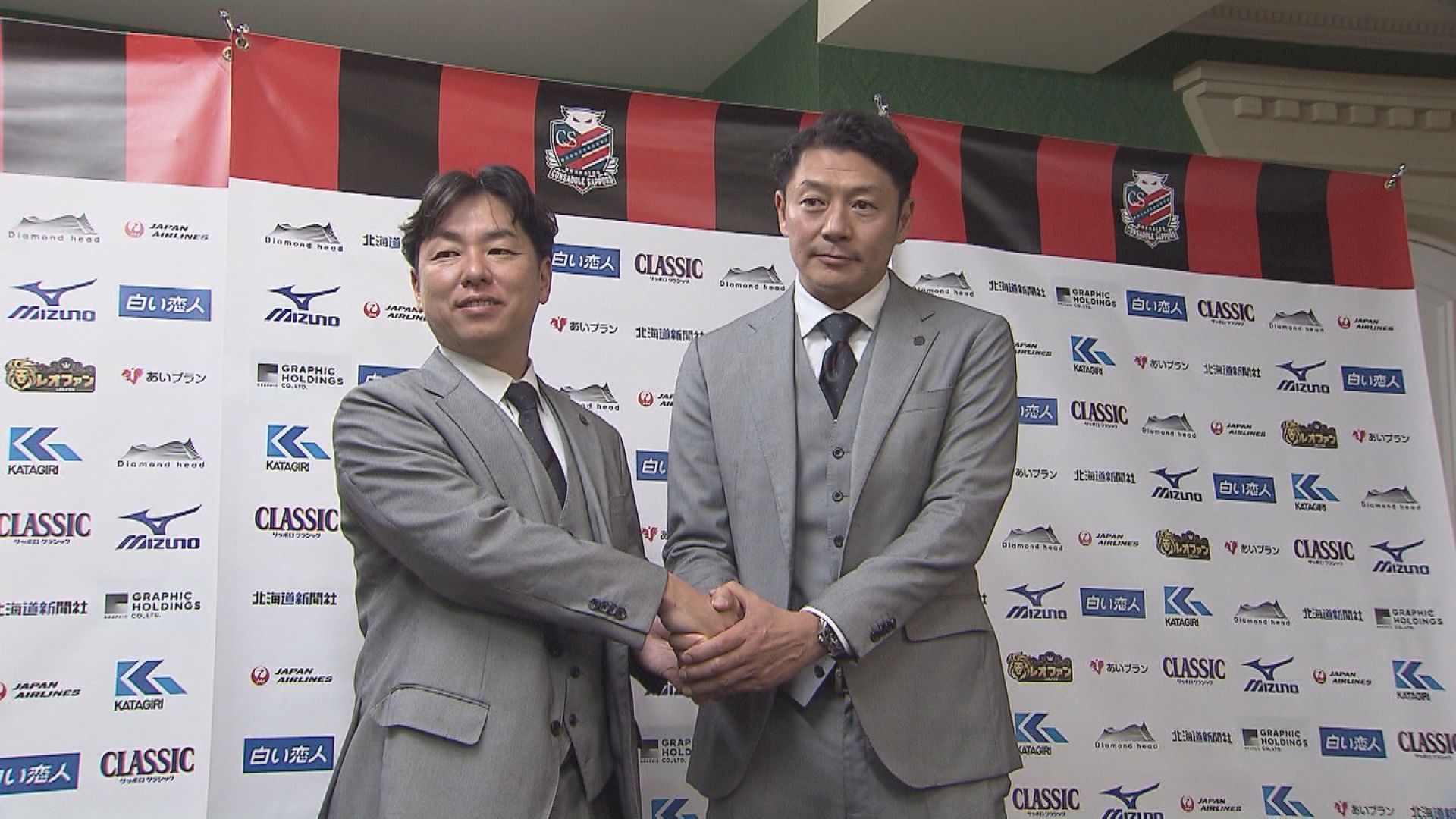 北海道コンサドーレ札幌の石水創代表取締役社長(左)と新GMに就任する河合竜二氏(右)