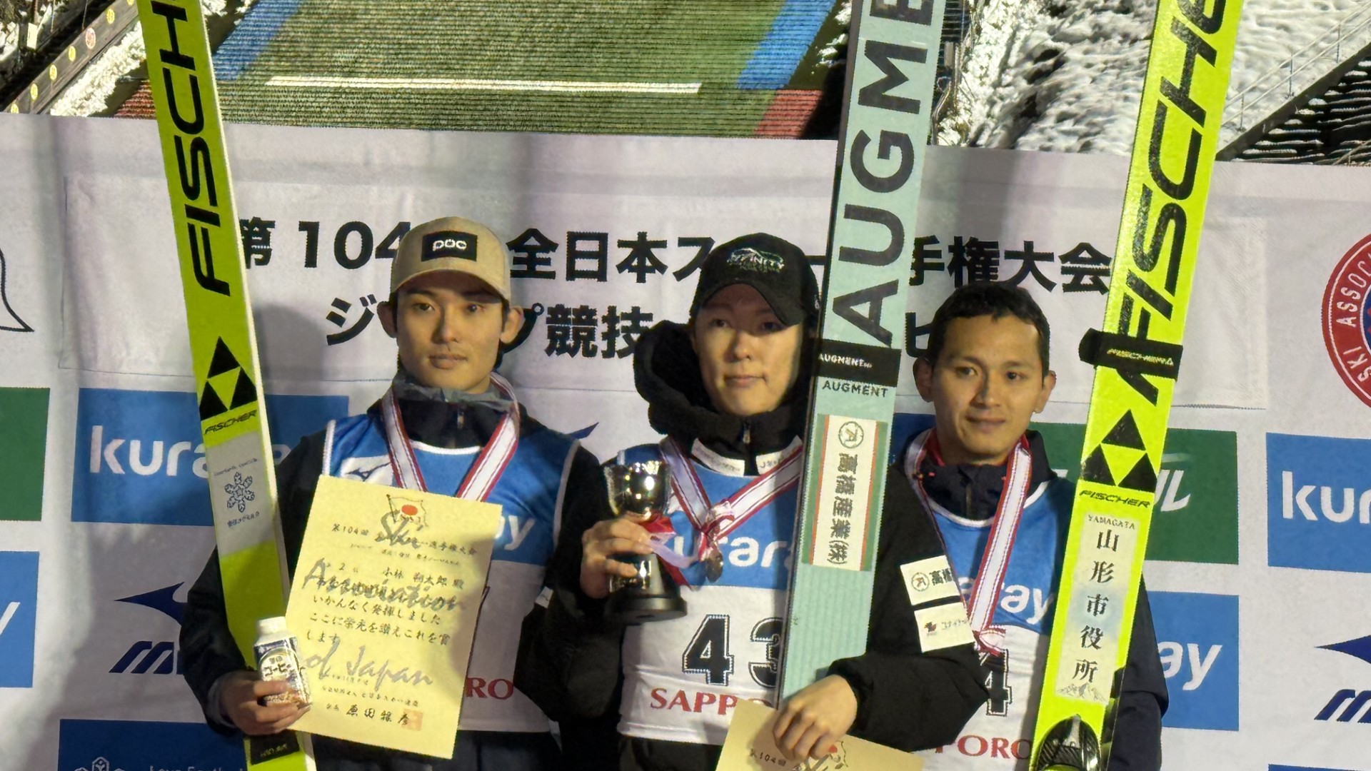 11月9日全日本スキー選手権ノーマルヒルで優勝した小林潤志郎選手(中央)