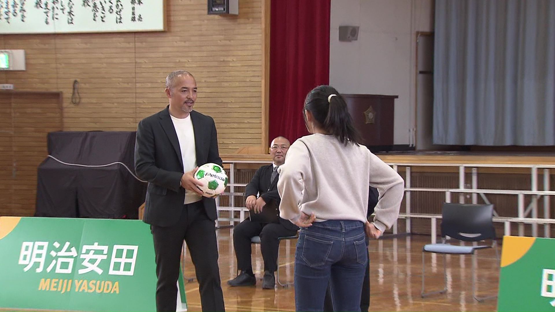 小野さんは今回、子どもの健全育成などへの貢献を目指す「『明治安田』の未来世代応援アクション with Jリーグ」の取り組みで訪れ、サッカーボールを届けました。
