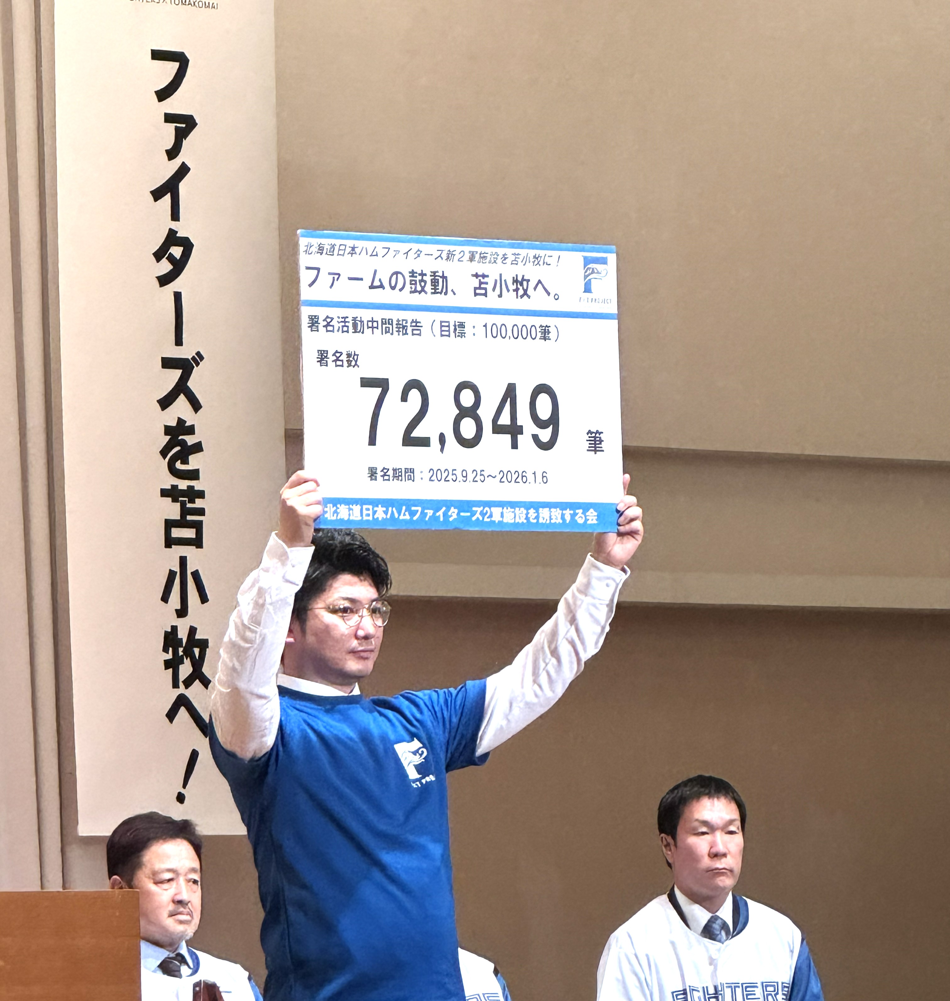 この交礼会はファイターズの2軍誘致の機運醸成を兼ねたもので、金沢苫小牧市長、市議会議員、誘致期成会のメンバーらはファイターズのユニフォームを着用して参加。会場では署名活動も行われました。