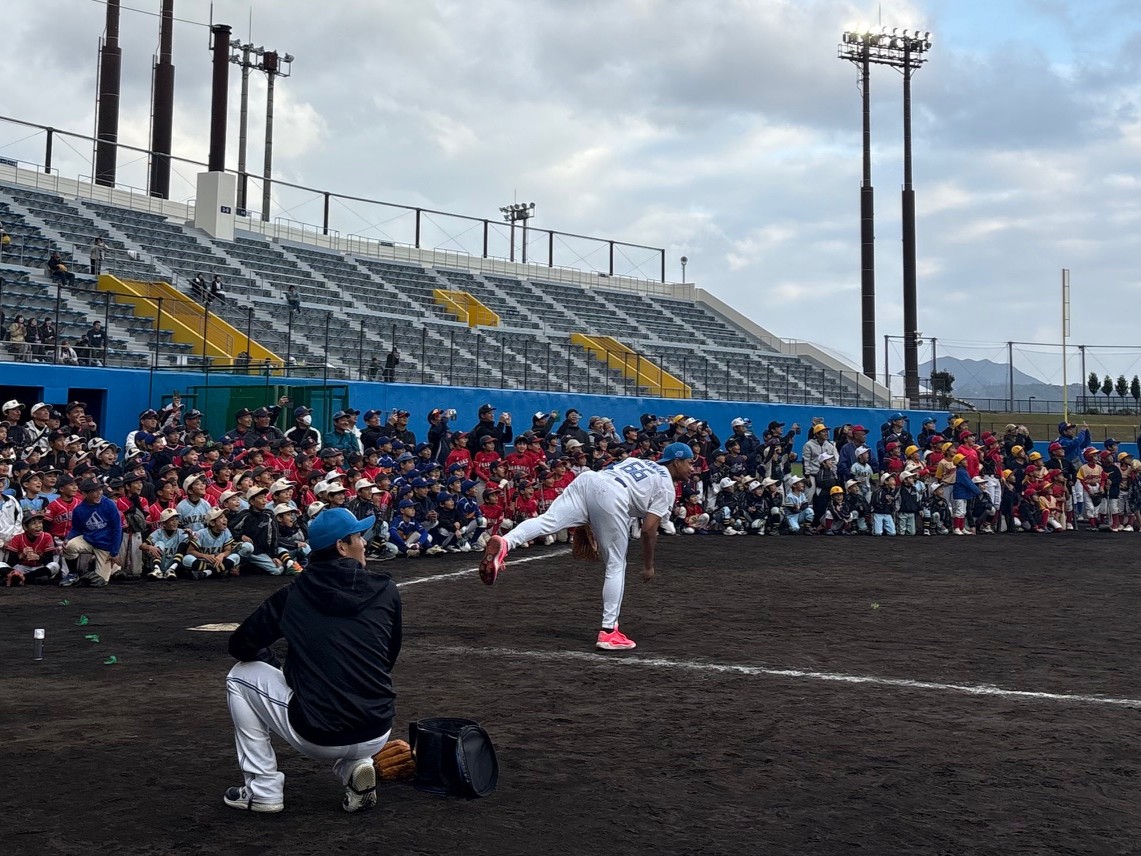 この日、「Enagicスタジアム名護」で開かれた野球教室に登場したのは、選手会長・清宮幸太郎選手ら15名もの豪華主力選手たち。講師として参加した伊藤大海投手、北山亘基投手、万波中正選手らは、地元名護市内の少年野球チームに所属する、およそ300名の子どもたちと触れ合い直接指導をしました。