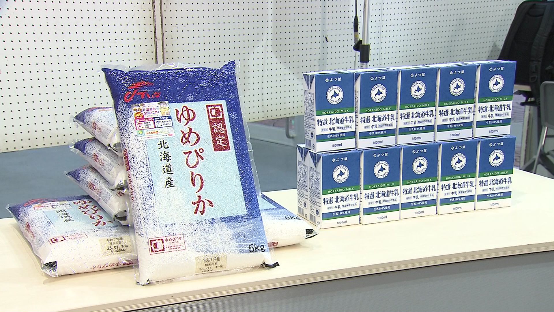 贈呈された北海道米「ゆめぴりか」と北海道産牛乳