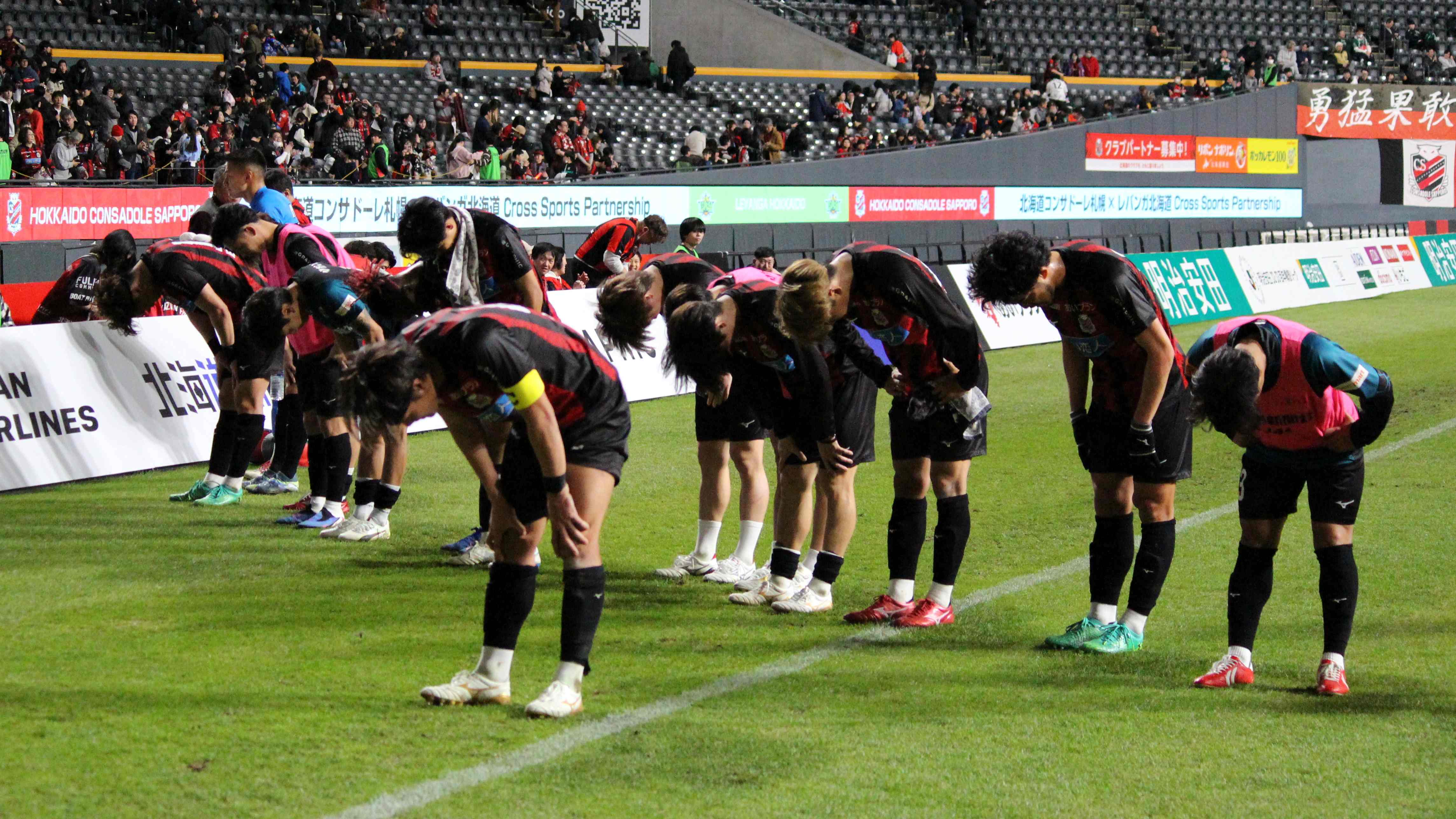 試合後、サポーターに挨拶する選手たち
