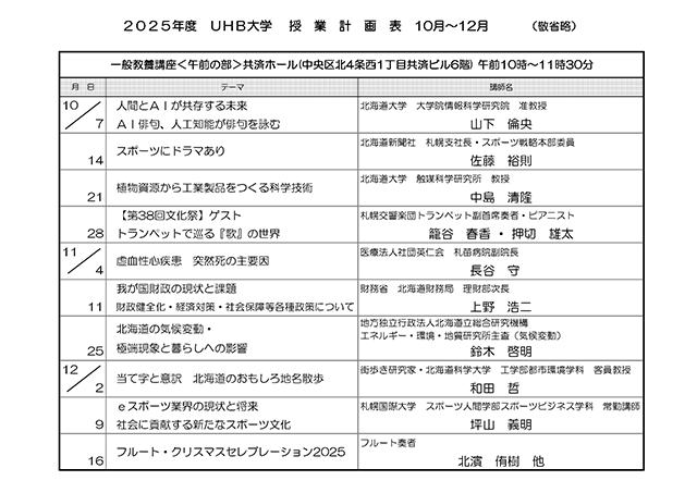 一般教養講座 授業計画表・令和7年10月~令和7年12月