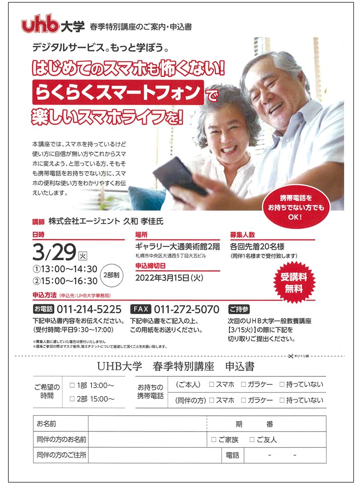 UHB大学では3月29日に春季特別講座として「スマホ講座」を開講します。