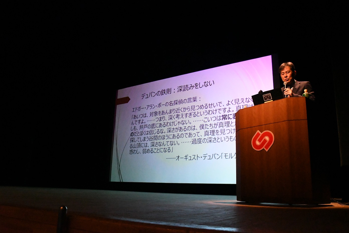 当初のテーマは「文学を平べったく読む」だったが「文学を探偵デュパンみたいに読むならば」に変更となった。